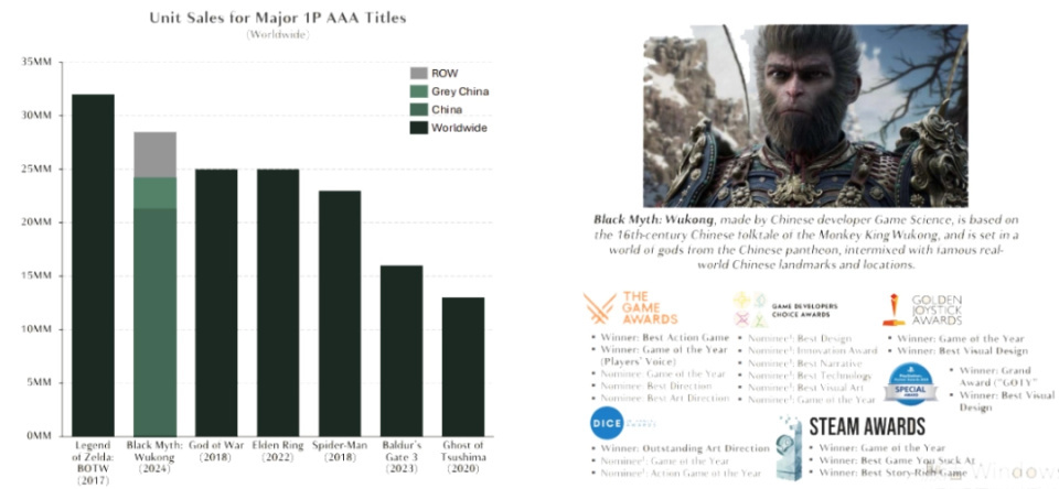 報告裏提到了《原神》《漫威爭鋒》這種在西方頗有成績的產品,也介紹了《黑神話:悟空》在品質和銷量上已足以媲美歐美的頂級3A遊戲。