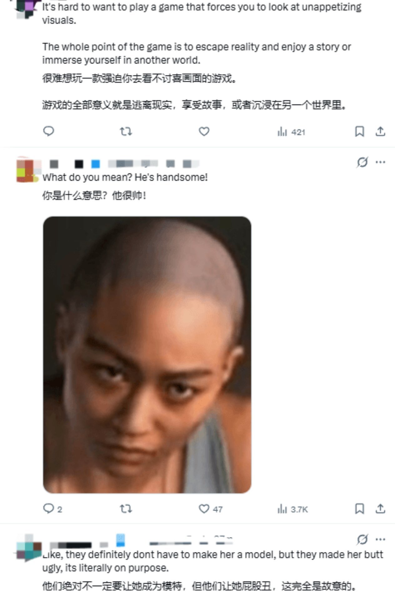 该游戏在PlayStation官方频道的点踩量超过15万,顽皮狗官方频道的点踩比达到2:1,累计点踩量超过26万。面对汹涌的负面评论,官方最终被迫关闭评论区。玩家对游戏中光头女主角的设计表达强烈不满,认为这是游戏行业过度“政治正确”的体现。部分玩家甚至自制美化版女主角,进一步凸显对原始角色设计的不满。女主角演员塔蒂·加布里埃尔曾在社交媒体上发表具有挑衅意味的内容,加剧了争议。不过,面对批评声音,她表示会将此视为动力,投入更多努力塑造角色。