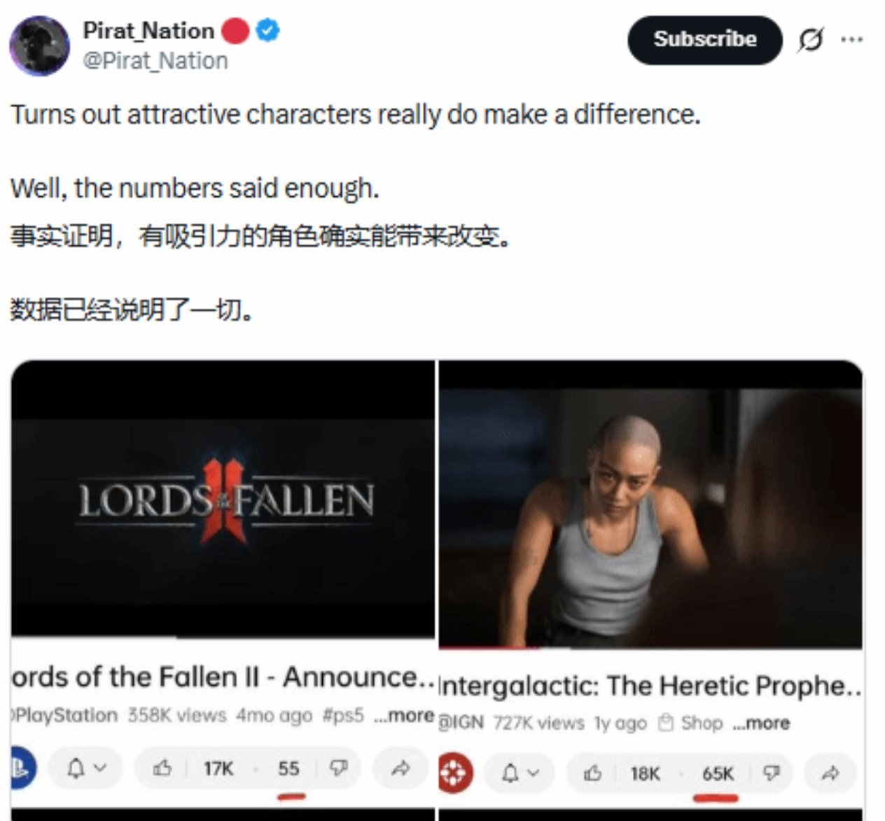 近日海外社交平台用户@Pirat_Nation发布数据显示,顽皮狗新作《星际:异端先知》预告片点踩量已达65K,远超《堕落之主2》的55条。这一对比揭示了玩家群体对顽皮狗新作的强烈负面反应。