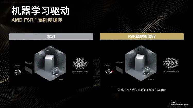 不过FSR Redstone如今除了可以基于机器学习实现游戏超分外,还新增了三项画面处理技术,分别是ML Frame Generation(机器学习帧生成)、ML Ray Regeneration(机器学习光线再生)和ML Radiance Caching(机器学习辐射度缓存)。