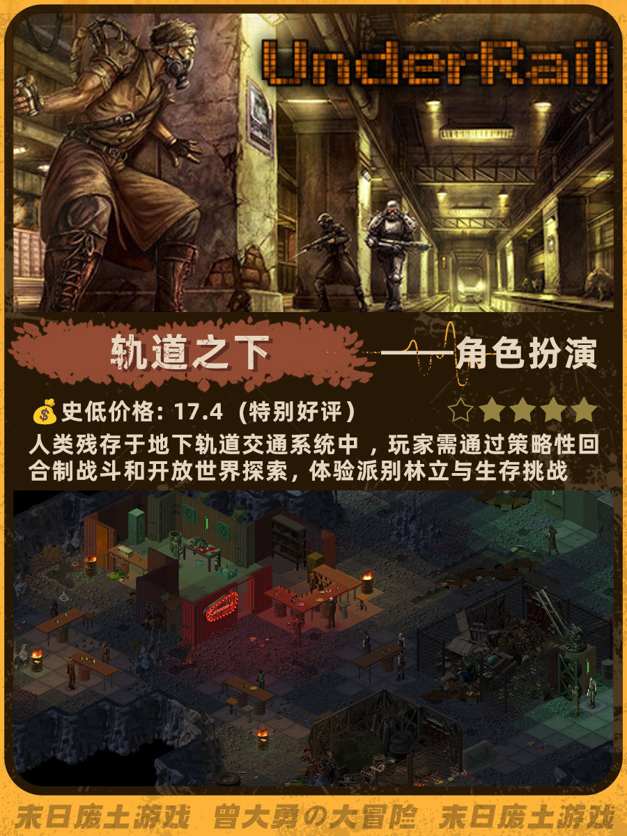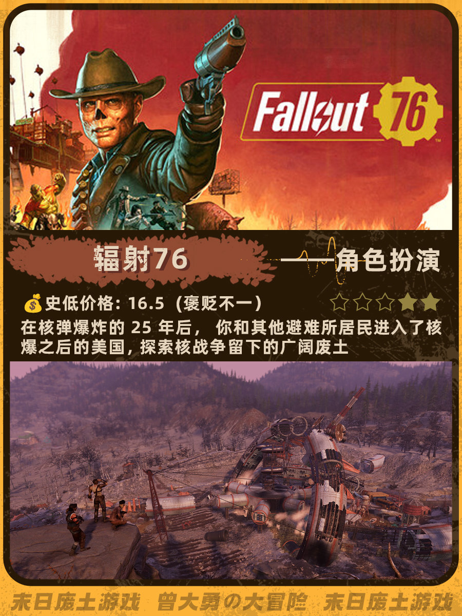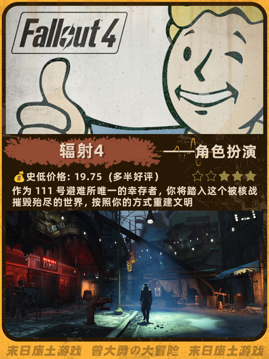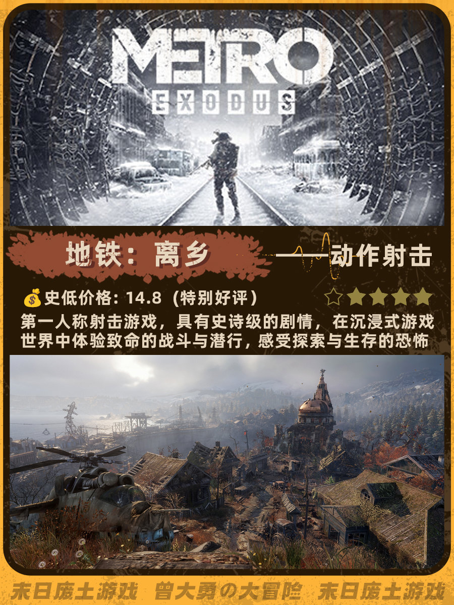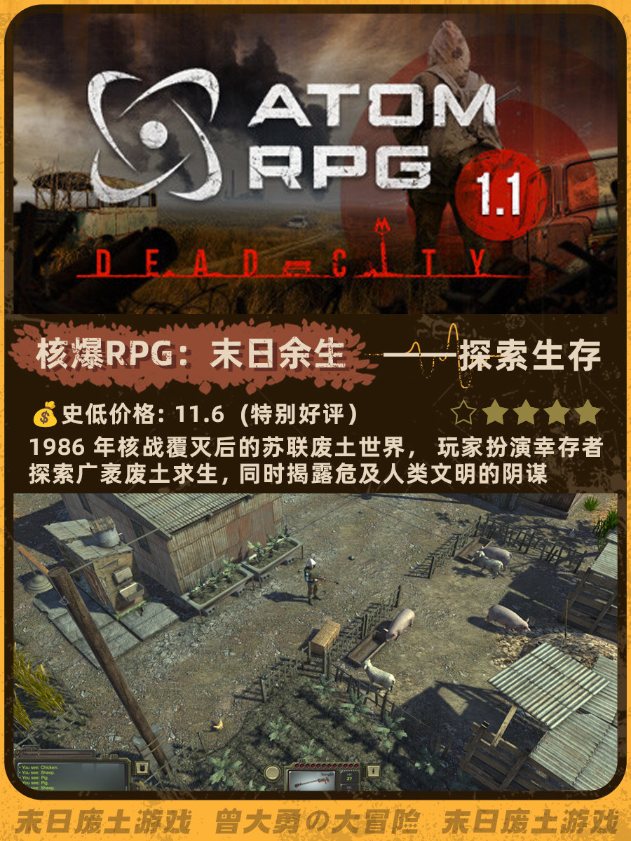 特别喜欢《辐射4》和《地铁离去》的末日荒芜感,去搜了一下发现做这个类型的帖子真的太少了......这次就搜罗了一下网上评价还不错的末日废土风游戏。图里包含史低价格、玩家评分、游戏概述