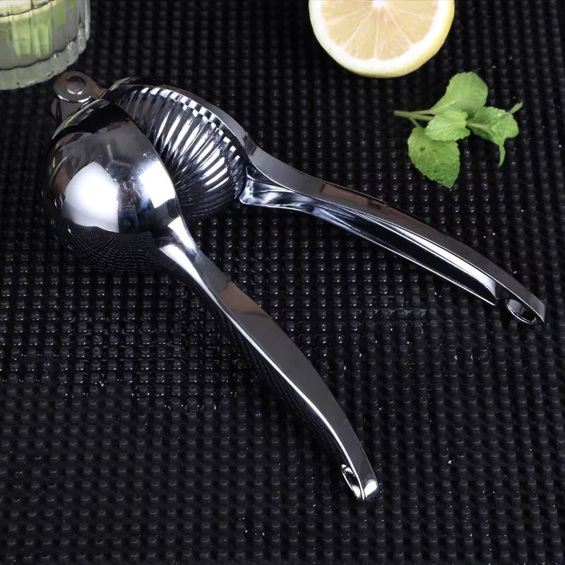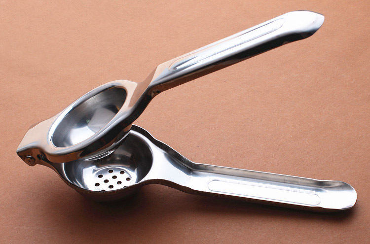 最推荐家庭使用的是铰链式压榨器,它利用杠杆原理,通过双手下压来榨汁。通常由一个盛放半颗水果的带齿凸起碗、一个与之匹配的压头和一个收集果汁的容器组成。高端产品为不锈钢材质,普通家用也有食品级塑料或铝合金制品。