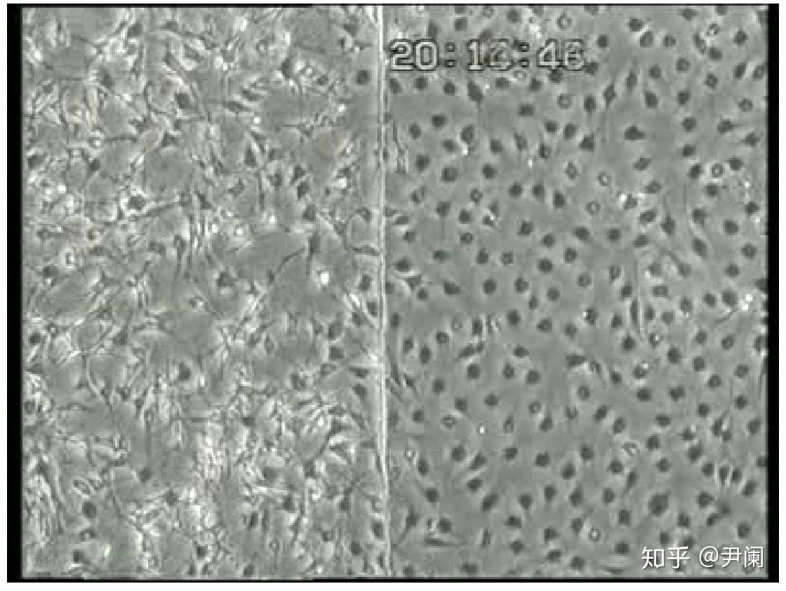 拥挤的癌细胞(左)和单层的正常细胞(右)
