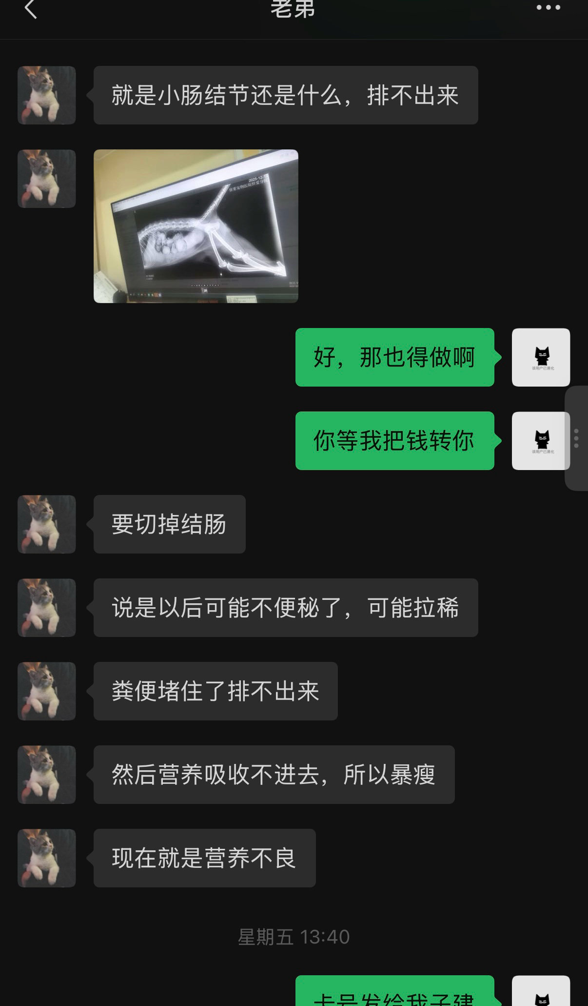 时至今日,弟弟也已经养了他们有两年的时间,期间经常给我发他们的视频。就在前几天,灰不拉几生病了,拉不出粑粑,我弟发现地上有星星点点血迹,赶紧带它去医院检查。巨结肠,要手术切掉一节肠子,不手术有生命危险,手术也有风险,术后会怎样尚不可知,我弟弟很难过,他说手术要小一万块,问我要不要治,我问他手术生活有影响没,受不受罪,他说后遗症是会腹泻其他应该没什么,我说那肯定要治,随即给他转了钱。
