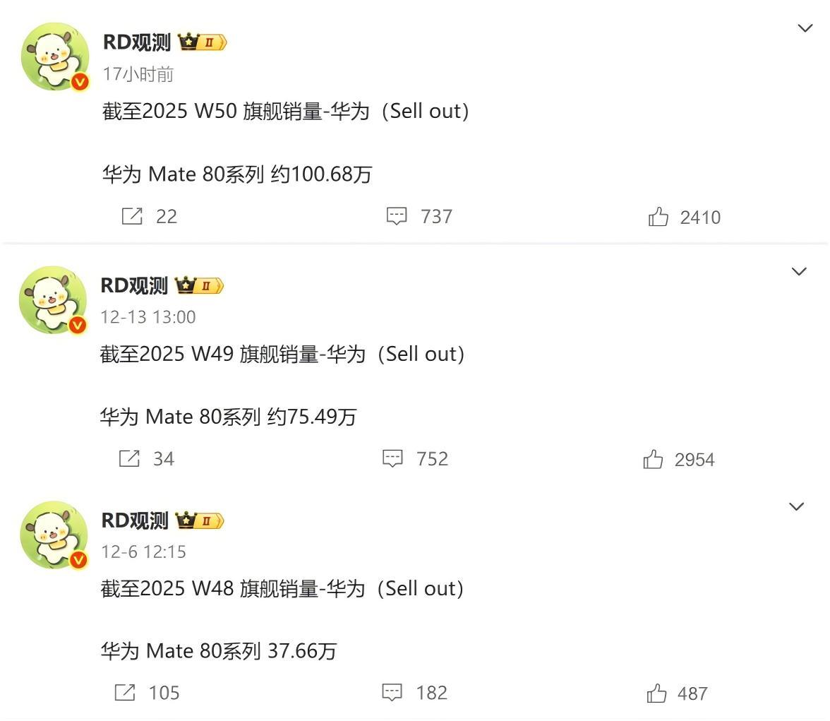 我们来分析近几周华为mate80系列的周销量表现,W48首销,当周3天的销量为37.66万,W49周销量为37.83万,W50周销量为25.19万,近3周以来,华为mate80系列的周销量都在25万以上。可能有人会说,随着时间的推移,华为mate80系列周销量肯定会下降。我认为不会,mate80系列的周销量近2个月以内都会稳定在20-30万,因为目前只有标准版现货,Pro以上版本一直缺货,处于供不应求的状态。而随着时间的推移,缺货会得到缓解,两者相抵,所以周销量大不会大降,如果供应充足,反而有望大涨。