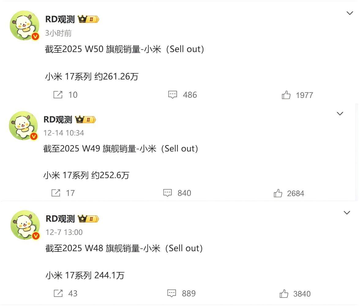 我们再来分析小米17系列的周销量变化情况,截至W48小米17系列总销量为244.1万,W49周销量为8.5万,W50周销量为8.66万,连续多周销量不足10万。从目前的形势看,小米17系列基本维持这个销量,如果不大降价,周销量大概率长时间维持在10万以下。另外,小米17Ultra将于近期发布,但考到产品定位和涨价,对于整个小米17系列的销量拉动相对有限。