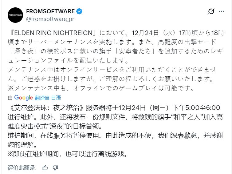From Software宣布,《艾尔登法环:黑夜君临》将于北京时间12月24日下午4点至5点停服维护更新。