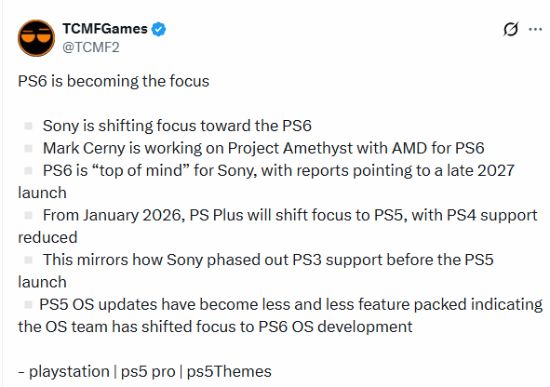 近期海外博主TCMFGames整理了PS6的最新进展,核心信息如下:索尼正将工作重心转向PS6,马克・塞尔尼(PlayStation 硬件架构师)正与AMD合作推进“紫水晶计划”(Project Amethyst),该项目为PS6的硬件研发项目。