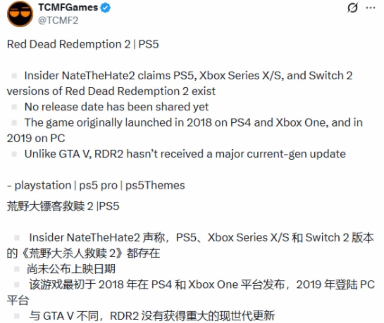 知名游戏爆料人NateTheHate近日明确表示,《荒野大镖客:救赎2》的“增强版”开发工作仍在进行,RDR1重制版的发布不会影响RDR2项目的推进。