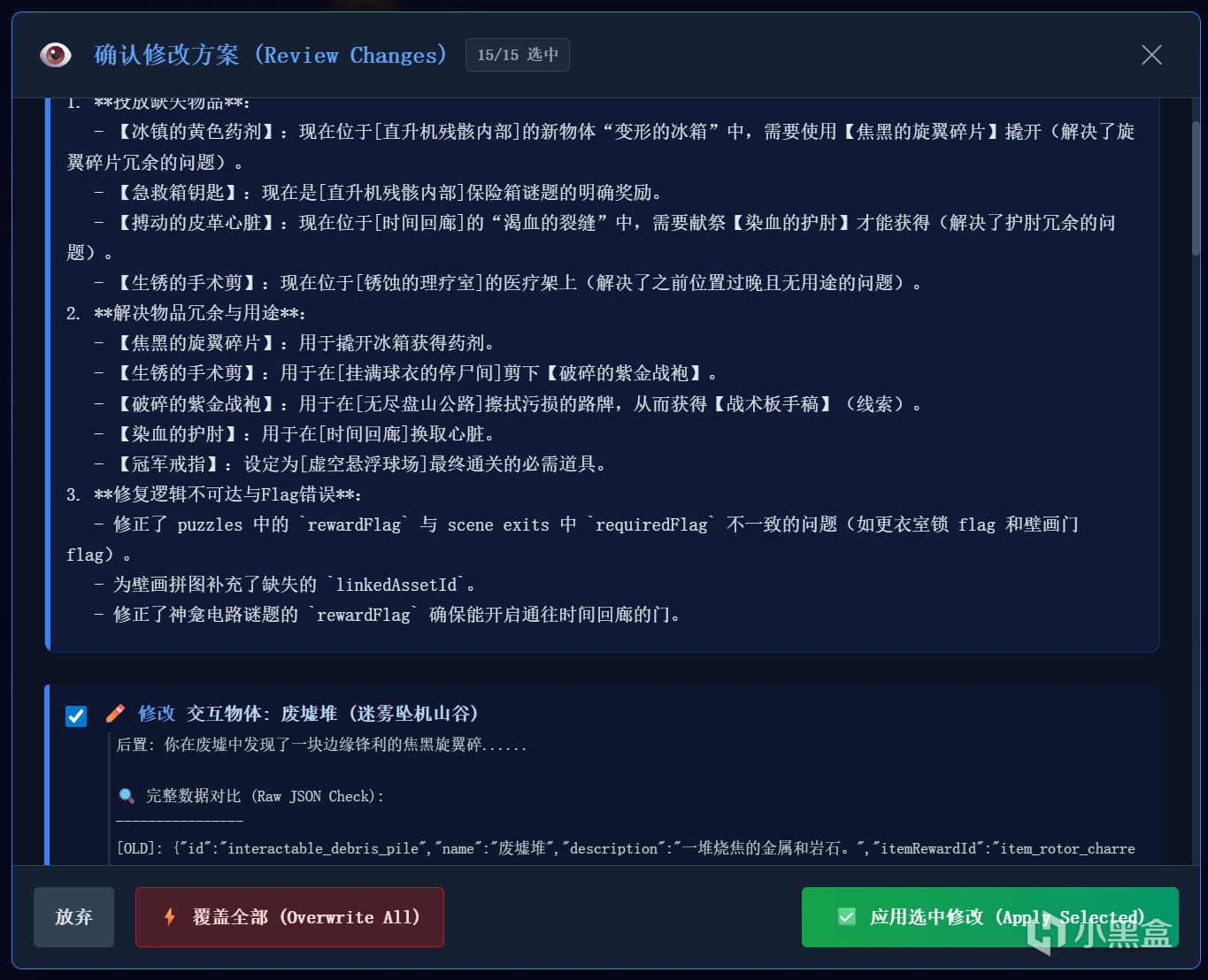 直到逻辑自检报告没有问题,就可以按T关闭制作页面,简单的游玩下了。不过,毕竟ai生成的逻辑总有可能会有不合理的地方,比如ai标记的线索实际上并没有给出任何提示(可以直接自行对文案稍作修改),以及,如果还有逻辑或者你觉得不合理的地方,你还可以直接告诉ai如何修改。