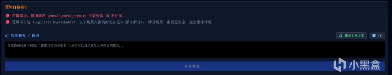 前往分析查看结果:首次生成的游戏或多或少是有点问题的,你可以点击修复,让ai自行修复