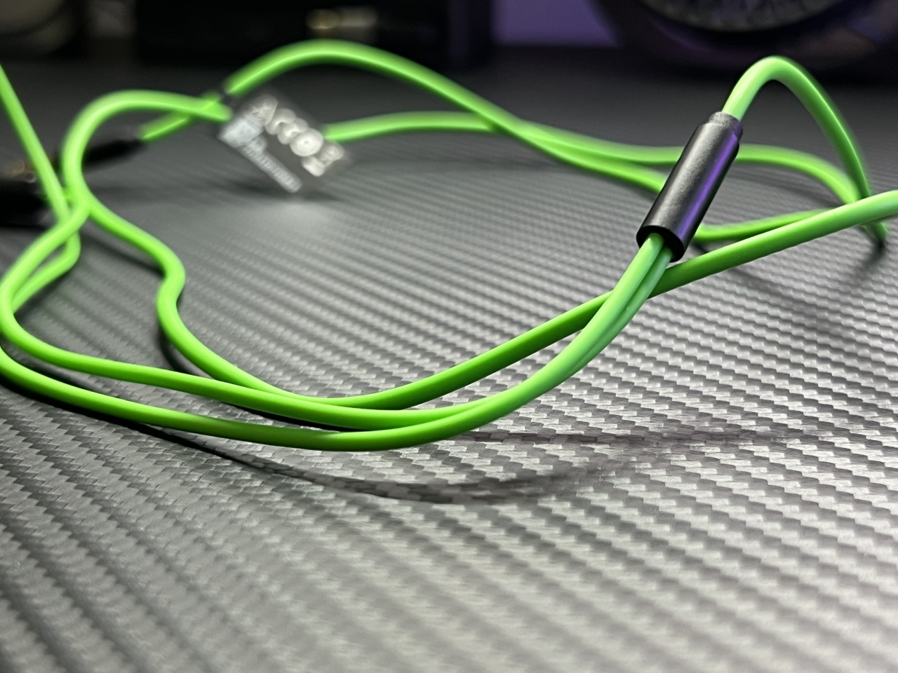 外觀這塊,這根綠色的線是真搶眼,經典的雷蛇綠,不看品牌看顏色就能一眼分辨出來,戰錘狂鯊V3的這根線不算軟,稍微有點硬,多用用應該會好些。