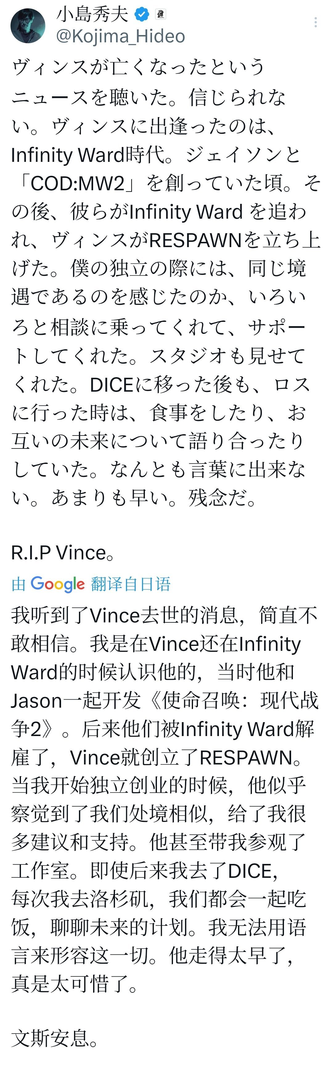 “听到Vince去世的消息,实在难以置信。我第一次与Vince相识,是在他还在Infinity Ward的时候。那时他正和Jason一起制作《使命召唤6:现代战争2》。后来他们被迫离开Infinity Ward,Vince创立了Respawn。等到我自己独立的时候,他大概是感同身受,给了我很多建议,也给予了我支持,还带我参观了他们的工作室。”“他之后转到DICE工作,每次我去洛杉矶,我们都会一起吃饭,聊彼此的未来。真的不知道该用什么语言来形容这种心情。他走得太早了,实在令人惋惜。安息吧,Vince。”