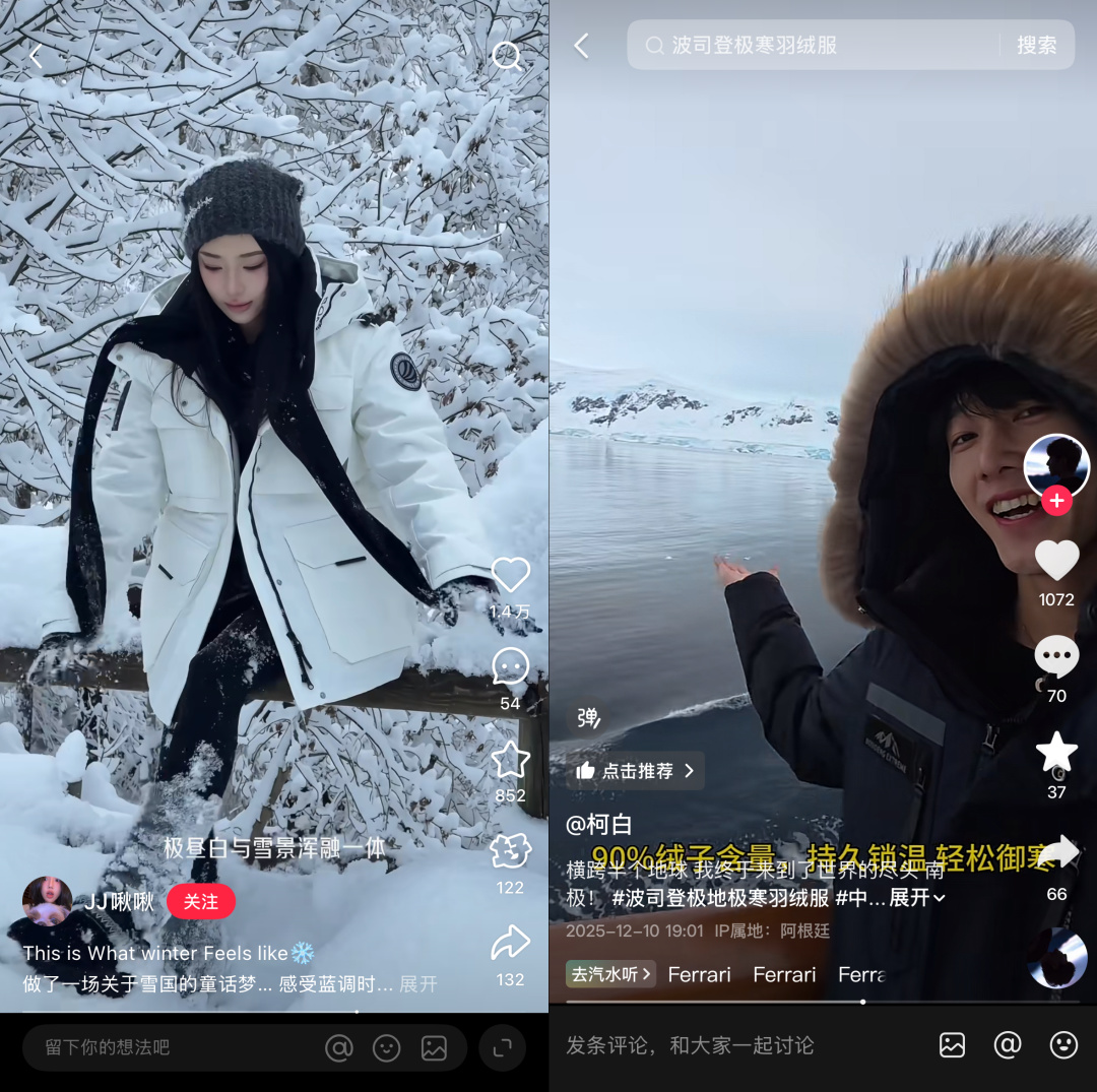 還有人在瑞士沃州的一個度假小鎮,穿着極寒系列與阿爾卑斯山的雪景渾融一體。甚至有網友去南極旅遊,身上也是穿着波司登極寒羽絨服。
