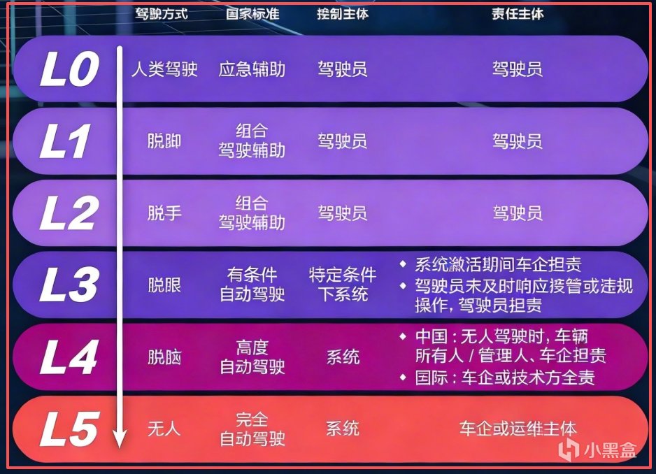 先搞清楚自動駕駛的級別劃分會更明白這事兒的分量。L1 就是定速巡航這類基礎輔助;L2 能同時管方向和車速,但眼睛必須盯着路面,隨時準備接手。到了 L3 纔算跨過關鍵門檻,系統能在特定路段完全接管,出問題主要由廠家擔責,人只要在系統提醒時接管就行。