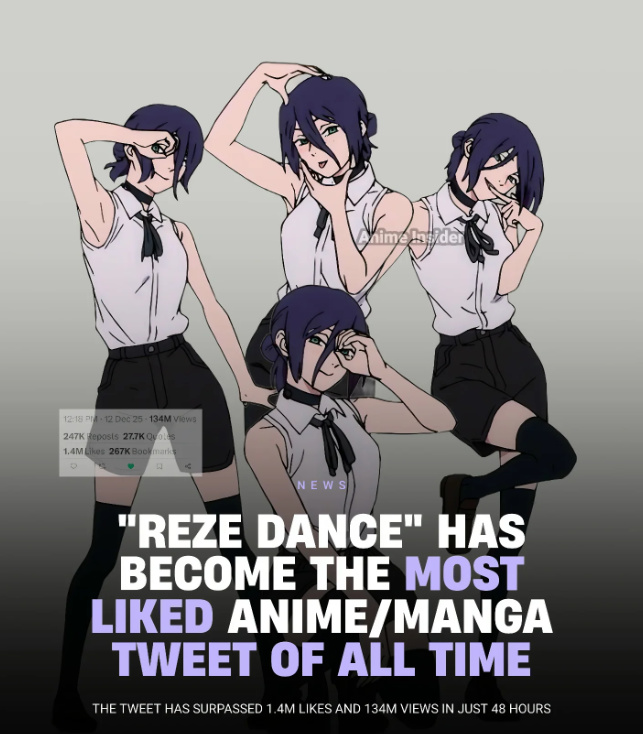 12月12日,音乐人米津玄师发布了一段宅舞动画。视频里,来自动画《电锯人:蕾塞篇》的女主蕾塞只是随音乐舞动,却像电子魅魔一般出圈再出圈。至今,她已经获得162.2万个喜欢,1.8亿次观看。