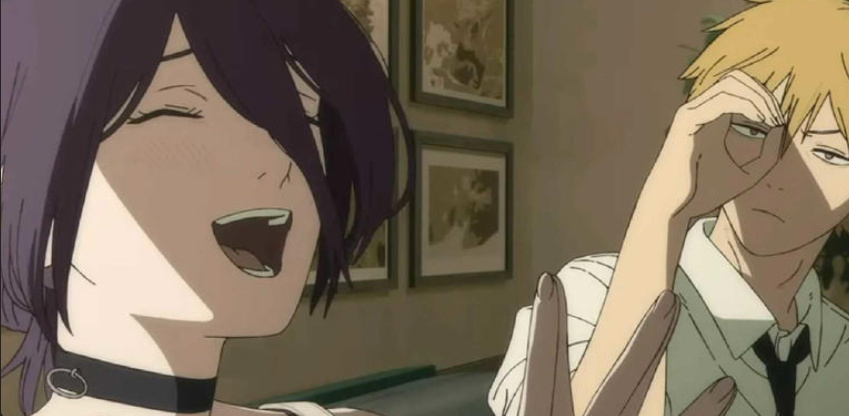 最明显的元素,是在“蕾塞舞”中一首一尾出现,拢共三次的“眼眶手势”。这个动作,动画里出现在男主角“电次”第一次与“蕾塞”约会时的场景。蕾塞主动热情地接近电次,甚至讲了个荤段子,让电次心生怀疑。把手比作镜框或显微镜的形状,意在表达“观察”,即仔细审视这个女人的目的。