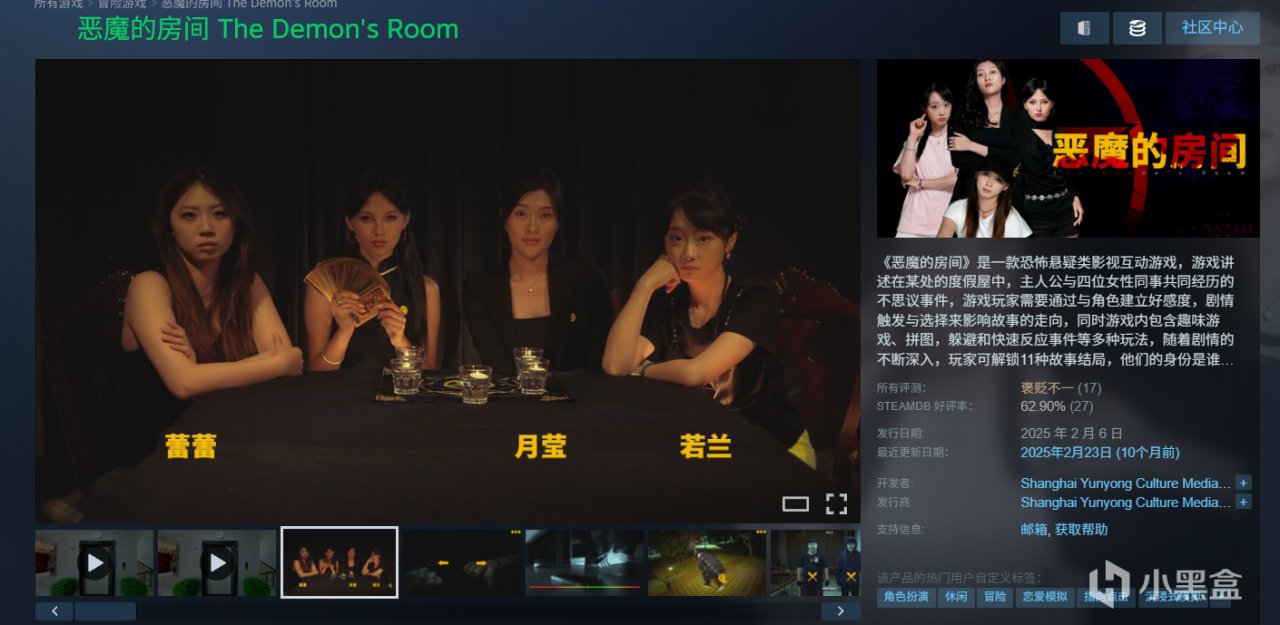 冬促折扣-20% 《恶魔的房间》是一款恐怖悬疑类影视互动游戏,游戏讲述在某处的度假屋中,主人公与四位女性同事共同经历的不思议事件,游戏玩家需要通过与角色建立好感度,剧情触发与选择来影响故事的走向,同时游戏内包含趣味游戏、拼图,躲避和快速反应事件等多种玩法,随着剧情的不断深入,玩家可解锁11种故事结局,他们的身份是谁?故事的真相到底是什么?期待您的探索!
