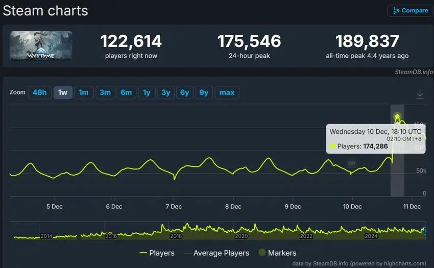 這原本應該也算是《Warframe》老玩家的日常了,但這次新版本帶來的新東西的確有着不一樣的吸引力,同時還包含了一些對遊戲體驗改善頗有幫助的內容——具體是哪些我們後面再提——從而產生一個驚人的現象:更新當天,遊戲的24小時在線人數高峯達到了175,546人,這是自2021年7月以來最高的同時在線玩家人數,距離系列最高的在線人數189,837人也只差了1萬多人。