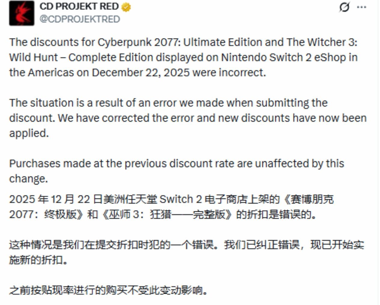 值得注意的是,CDPR对NS2版《赛博朋克2077》价格异常事件采取了不同处理,承认操作失误并承诺已经购买的不收回!