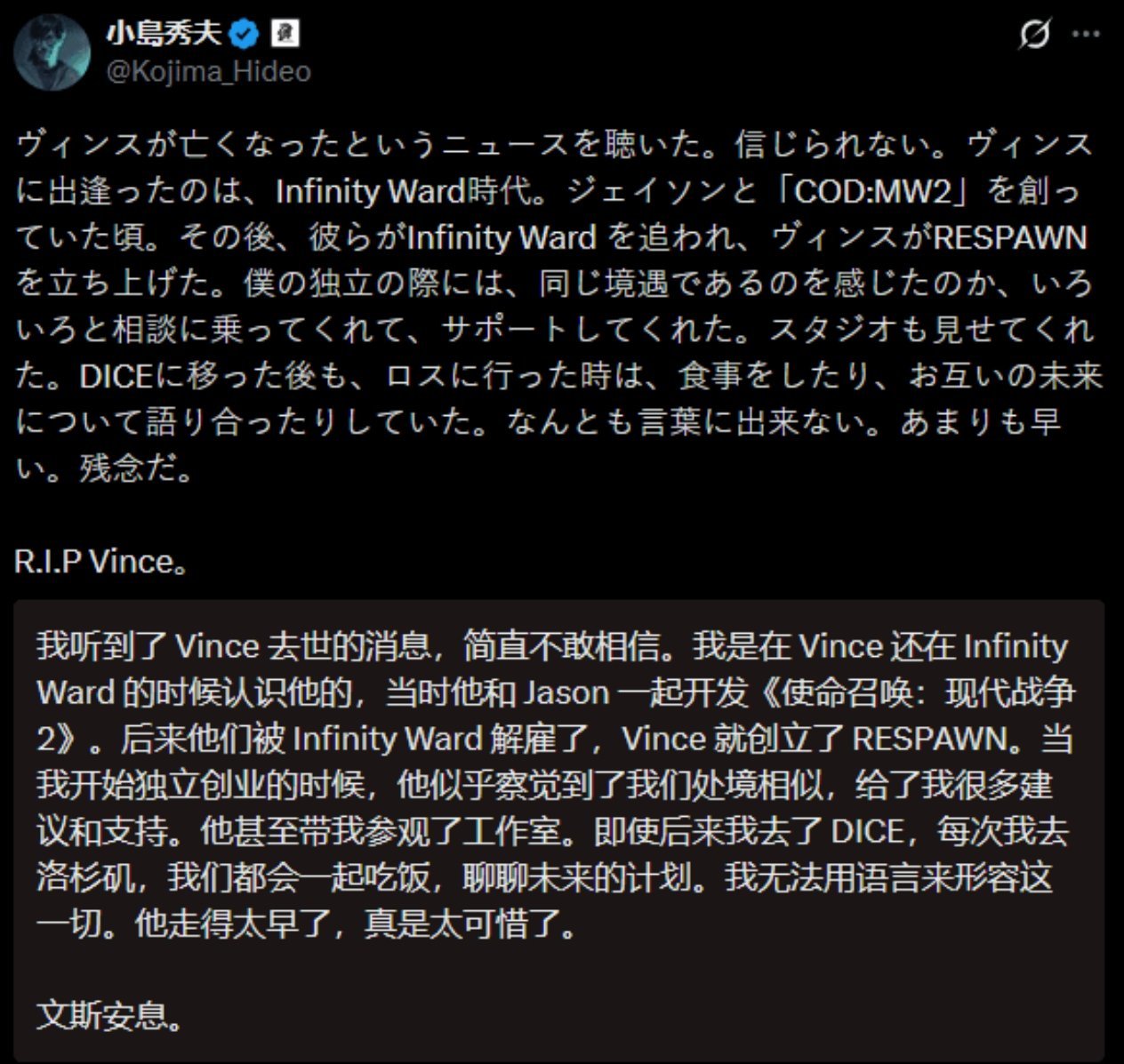小岛秀夫回忆,他最初与赞佩拉相识时,赞佩拉还在Infinity Ward工作室,正与Jason West一起制作《使命召唤6:现代战争2》。“后来他们被迫离开Infinity Ward,Vince创立了Respawn。等到我自己独立的时候,他大概是感同身受,给了我很多建议,也给予了我支持,还带我参观了他们的工作室。”小岛秀夫在悼文中写道。赞佩拉之后转到DICE工作,小岛秀夫提到每次他去洛杉矶,两人都会共进晚餐,畅谈彼此的未来规划。这位《死亡搁浅》的制作人感慨道:“他走得太早了,实在令人惋惜。安息吧,Vince。”