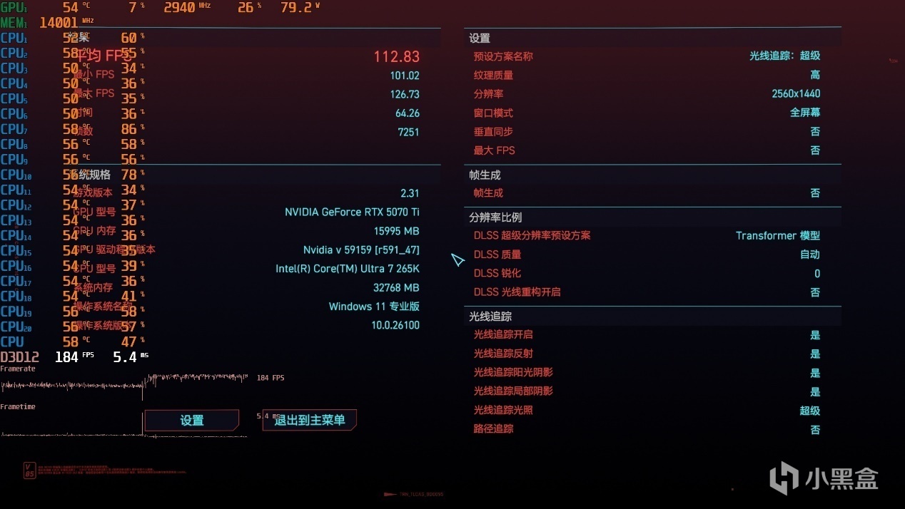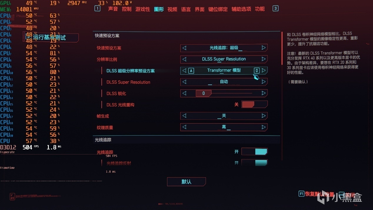 ▼賽博朋克2077,2K分辨率,光追超級畫質,DLSS大力水手自動,拼好幀關閉。