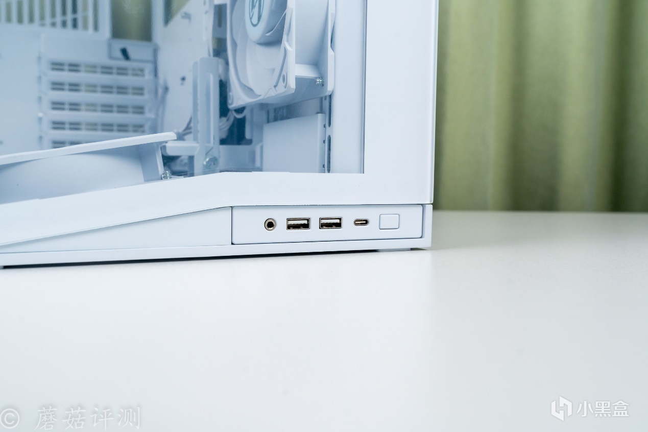 ▼機箱的IO面板默認在機箱前部的右下角,標配一個開機鍵、兩個USB 3.0接口、一個Type-C接口和一個3.5mm的音頻接口。另外,這個IO面板是支持移動的,除了前部之外,還可以安裝在頂部,方便機箱放在桌面下部使用。