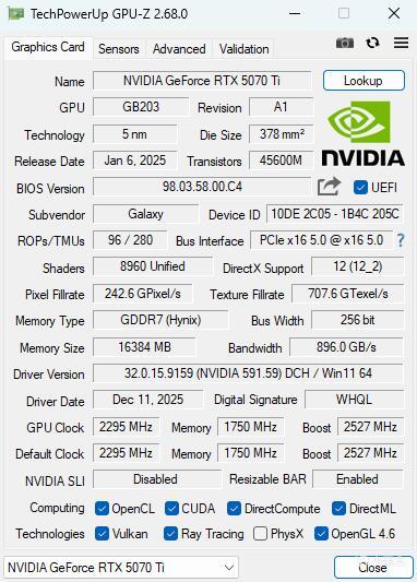 ▼簡單看下顯卡的參數,核心是GB203,流處理器8960,顯存是16GB的海力士出品的GDDR7,位寬265bit,不錯不錯。