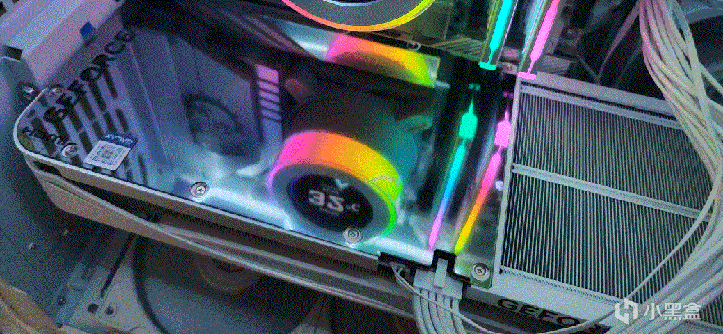 ▼影馳這張顯卡的背板默認是鏡面效果的,配合機箱內部其他硬件的RGB燈效的光影效果真不錯。