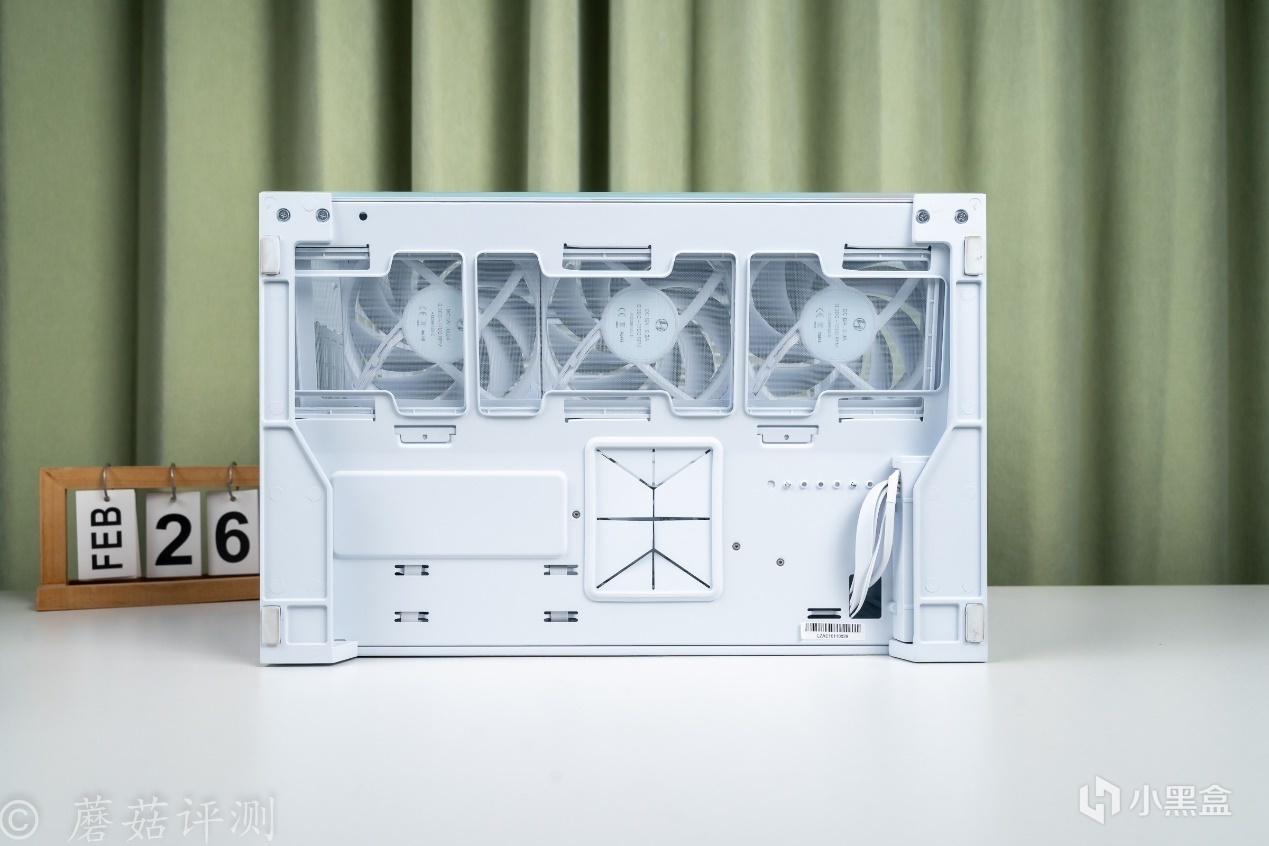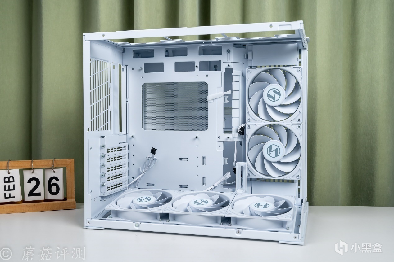 ▼機箱內部標配5把機箱風扇,均爲反葉、進風。機箱底部的三把機箱風扇還採用特殊的傾斜設計,方便在照顧顯卡散熱的同時,儘可能的促進機箱內部的空氣流動。