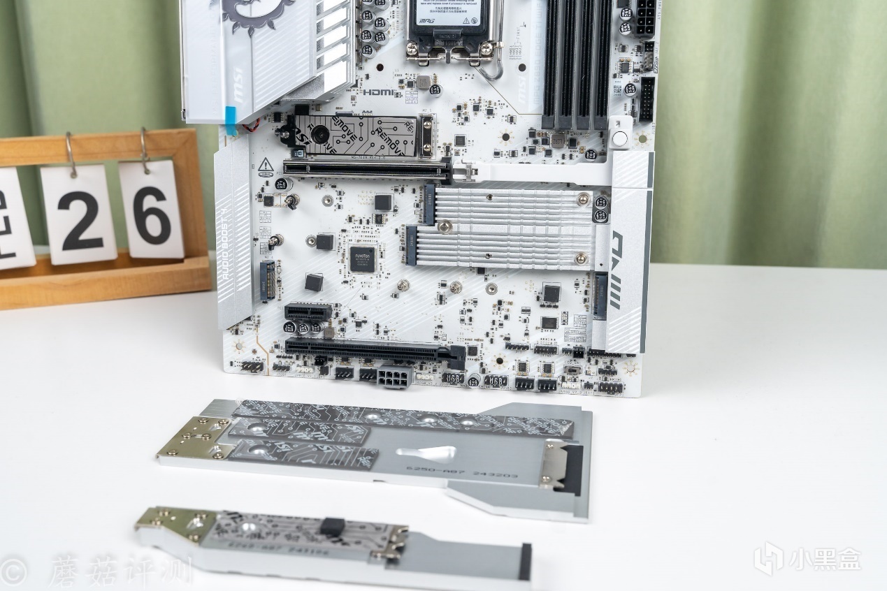▼這些金屬覆蓋件支持快拆設計,日常拆裝非常方便。顯卡的固定卡扣也設計了特殊的機械結構,放到了主板的右側,且採用兩檔設計,拆裝顯卡特別方便。另外,M2的金屬覆蓋件,均有導熱墊設計,可以快速傳遞固態硬盤的熱量。