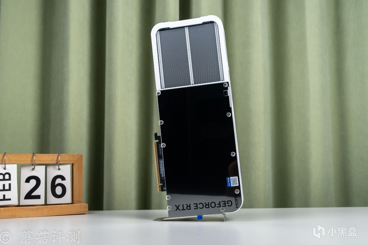 ▼顯卡背面標配鏡面背板,顏值很漂亮。在顯卡的尾部,還有鏤空設計,方便散熱風扇吹透散熱鰭片,提高散熱效率。