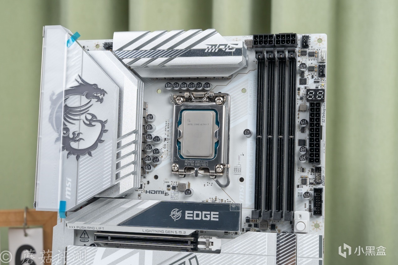 ▼主板用的是微星的Z890刀鋒鈦,主板左側供電散熱件的表面,有微星經典的龍標LOGO,支持ARGB燈效,支持主板同步。