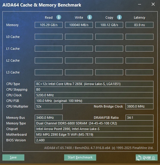 ▼在主板BIOS中打開內存優化選項,選擇BenchMark模式,跑個內存的讀寫測試,內存的讀取速度105.29GB/s、寫入速度100040MB/s、複製100.12GB/s,延遲83.9ns,整體性能表現不錯。