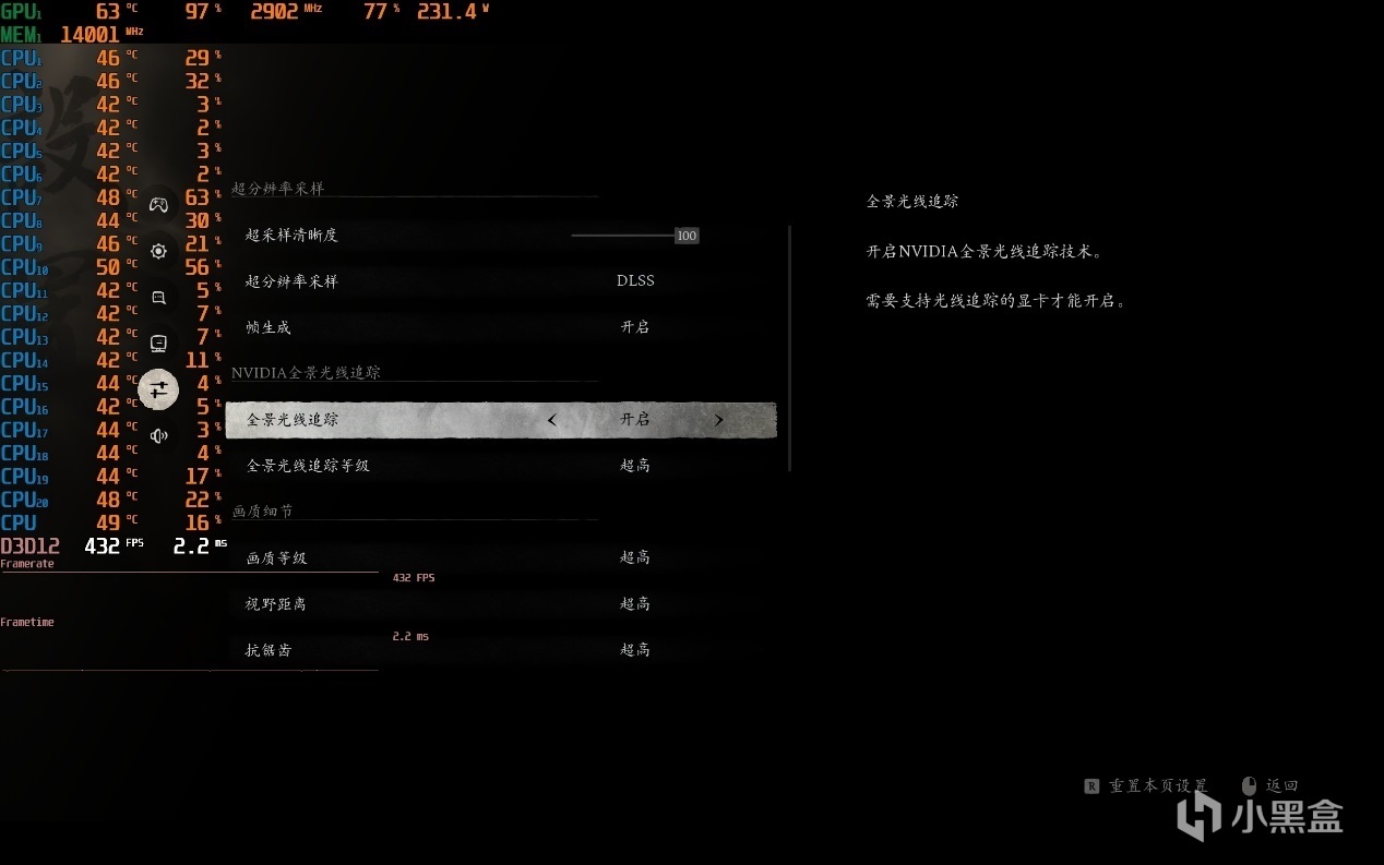 ▼黒神話悟空,2K分辨率,畫質超高、光追超高,超採100。