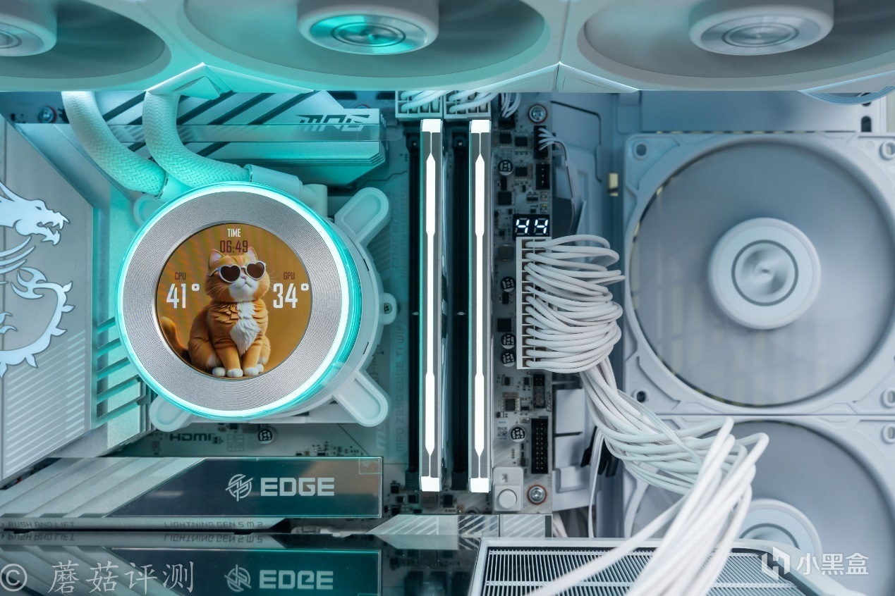 ▼水冷排輕鬆安裝到機箱的頂部,根據水冷管的長度和處理器插座的位置,合理的梳理下水冷管。不過,這塊微星Z890刀鋒鈦主板的頂部金屬散熱片高度有些高,水冷管無法梳理到中間,正常情況下,是可以梳理到中間的,視覺觀感更好一些。