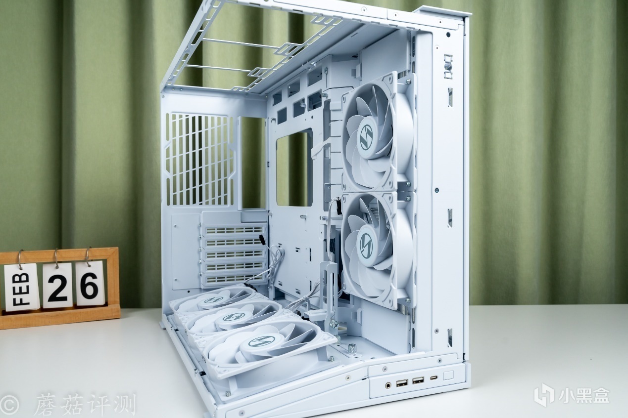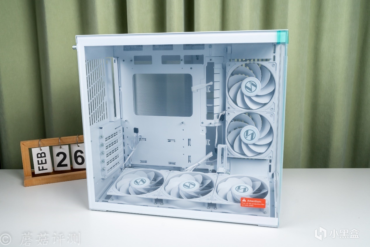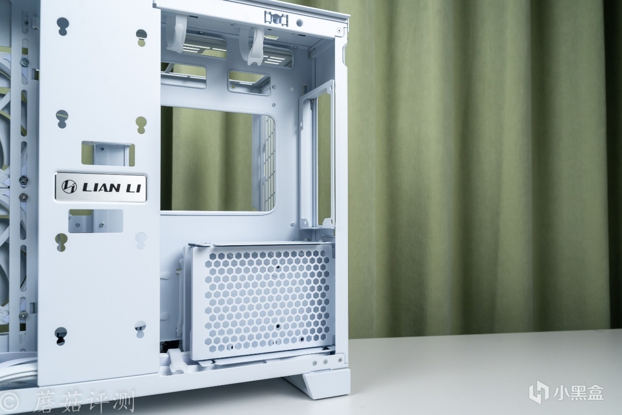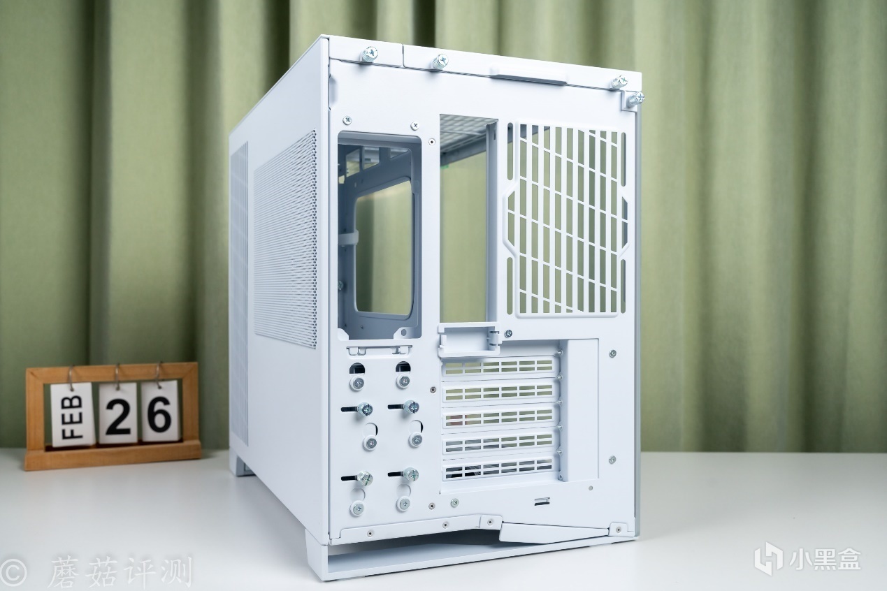 ▼機箱的玻璃側透面板、頂部的金屬蓋板採用卡扣和螺絲固定,日常拆裝很簡單。機箱內部的空間巨大且完整,左側是主板固定位,最大支持ATX規格,支持背插主板。