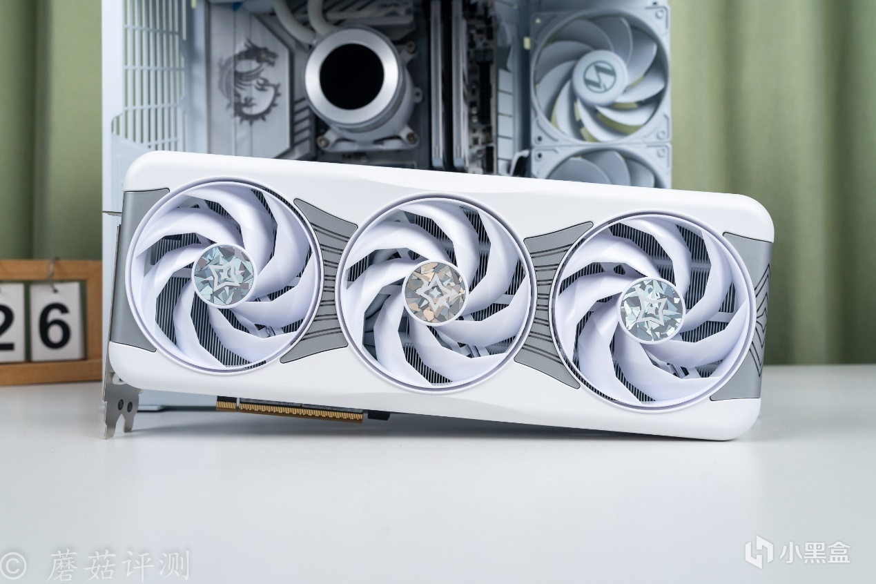 ▼顯卡正面是三把95mm規格的霜環風扇,扇葉的尾部連接到一個圓環上,日常運行更穩定,還能梳理風道。