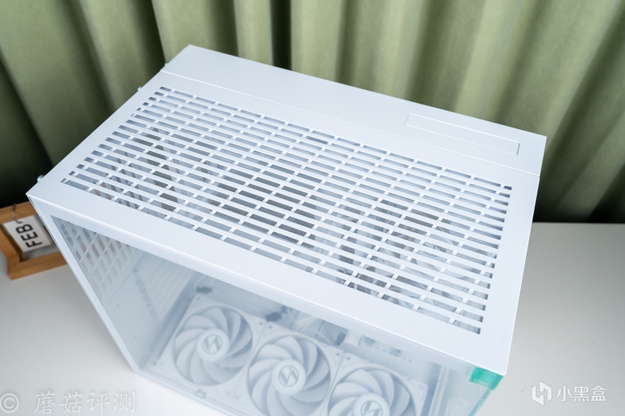 ▼機箱頂部,是大面積的散熱格柵,內部標配防塵網。