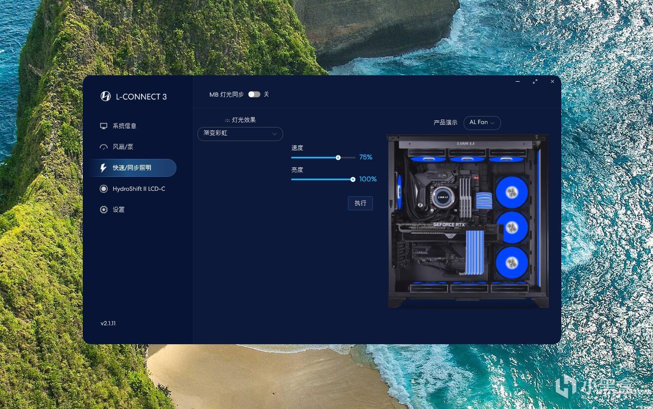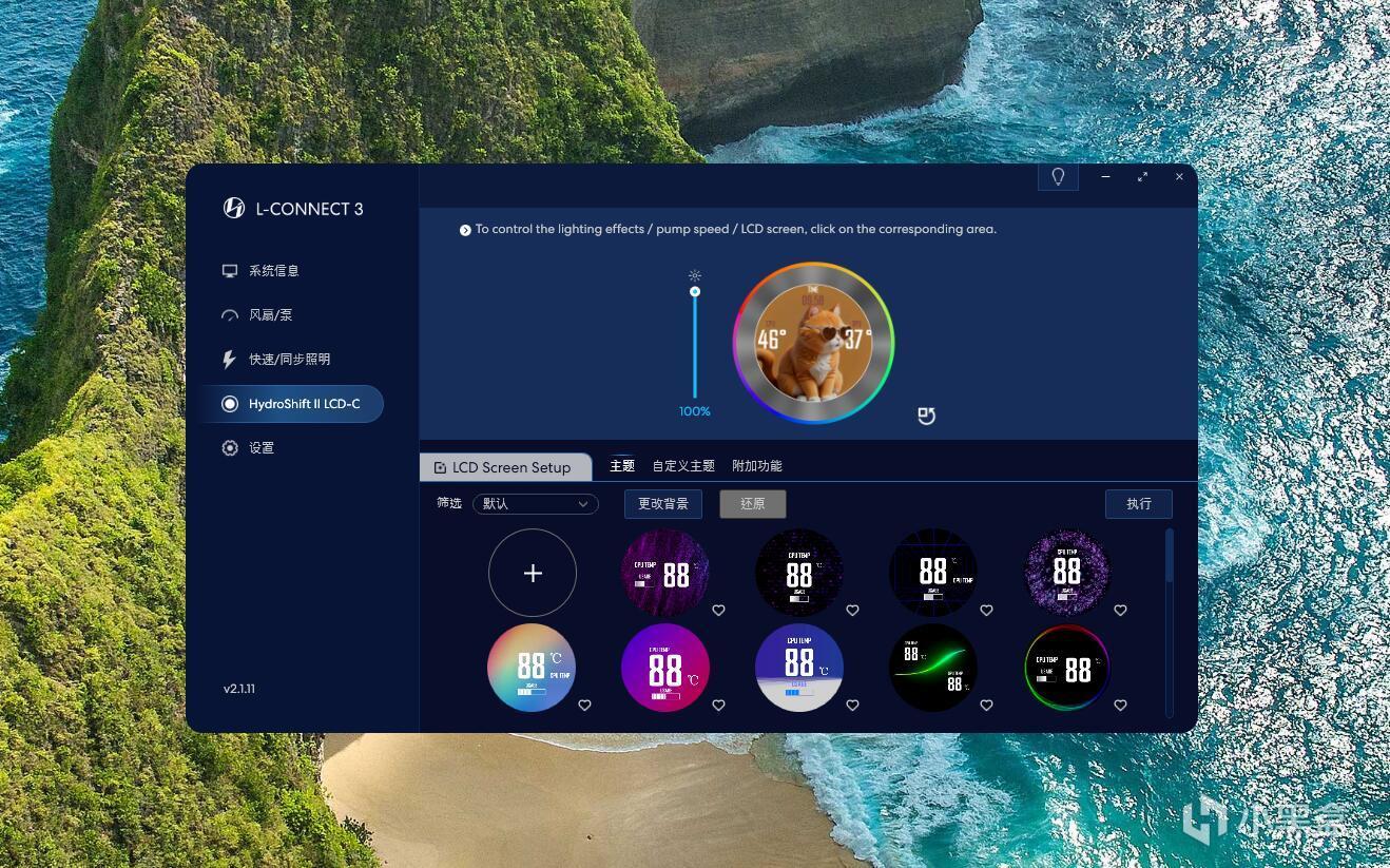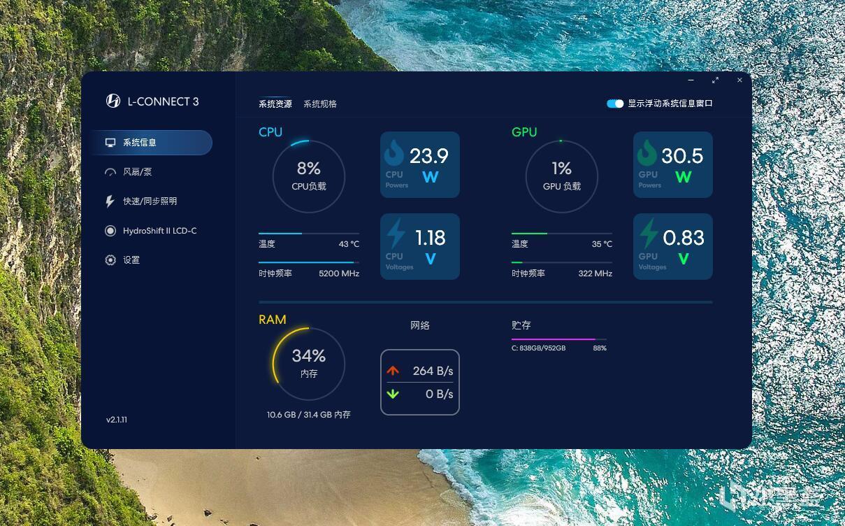 ▼聯力這款隱流Ⅱ代一體式水冷,支持聯力的L-CONNECT 3,這個軟件的功能很強大,首頁會顯示各種硬件信息,包括處理器頻率、溫度、功耗、電壓,顯卡的功耗、溫度、電壓、佔用等,下面還有內存、網絡和固態等信息,很豐富。這款軟件不僅可以收集這些信息,還默認內置了一個浮動信息窗口,方便在桌面查看各種硬件信息。