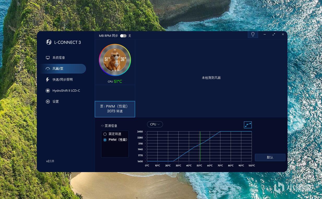 ▼這款軟件可以控制水冷的水泵、冷排風扇轉速,支持畫曲線。不過蘑菇選擇把插頭插到主板上,讓主板來控制轉速。