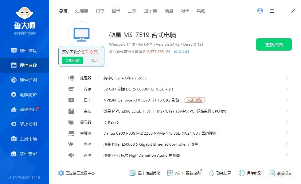 ▼整機配置一覽,處理器是265K,主板是微星的Z890刀鋒鈦,顯卡是影馳的RTX 5070 Ti星曜,整機配置很高。