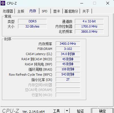 ▼內存打開XMP,頻率輕鬆穩定6800MHz,時序34-45-45-108。