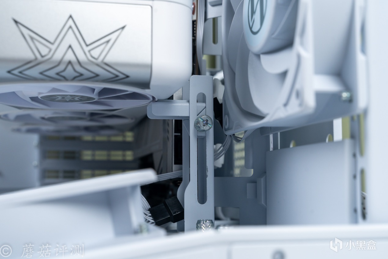 面對這種情況,聯力拿出了自己的隱流系列水冷,通過特殊的水冷管走線、以及配套的金屬輔助固定扣具,巧妙的把水冷管放到了和水冷排平行的後側,搭配可移動的輔助固定支架,調節水冷管的下管位置,從而獲得更加出色的機箱、主板兼容性,體驗不錯。