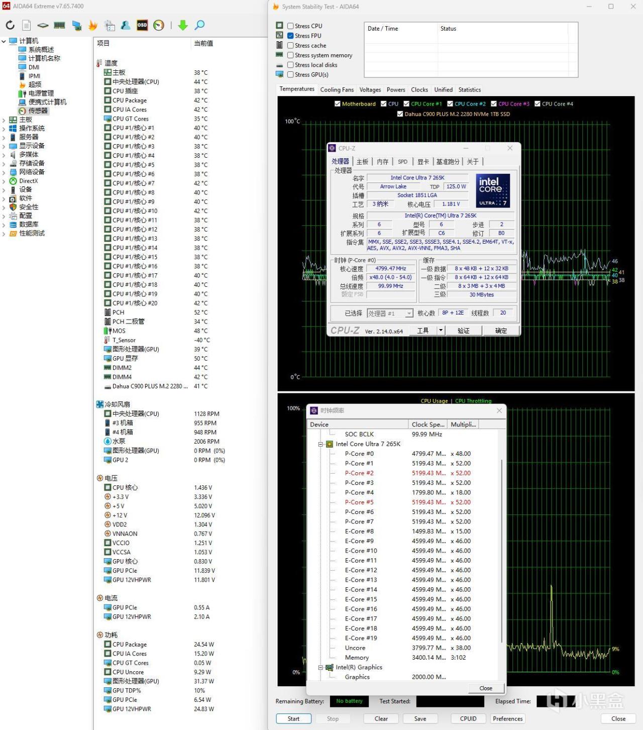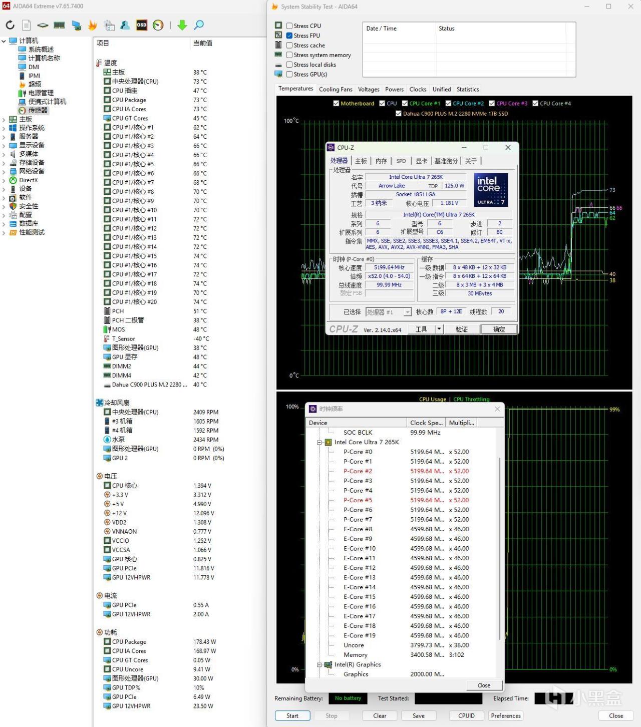 ▼跑個CPU-Z的壓力測試,處理器功耗在180W左右,P核睿頻5.2GHz、E核睿頻4.6GHz,溫度73℃,南橋51℃,供電48℃,顯卡核心38℃,固態40℃。