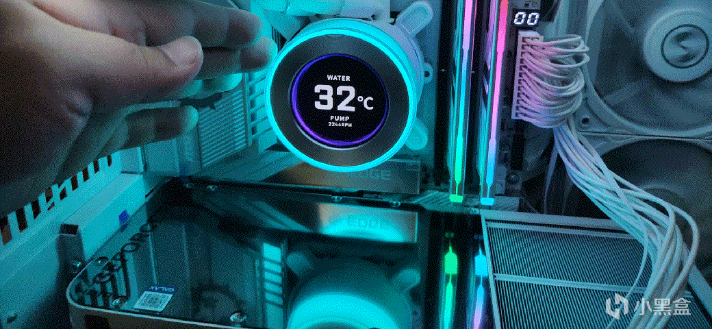 ▼水冷頭側面頂部還有一圈圓環形的燈帶,乳白色的,柔光效果不錯。另外,水冷頭頂部的這個圓環還是一個機械結構,支持旋轉,刻度感明顯,正時針旋轉和逆時針旋轉可以操控不同的效果。