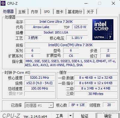 ▼簡單看下處理器的硬件參數,8個P核、12個E核共20線程,三級緩存30MB,不錯不錯。