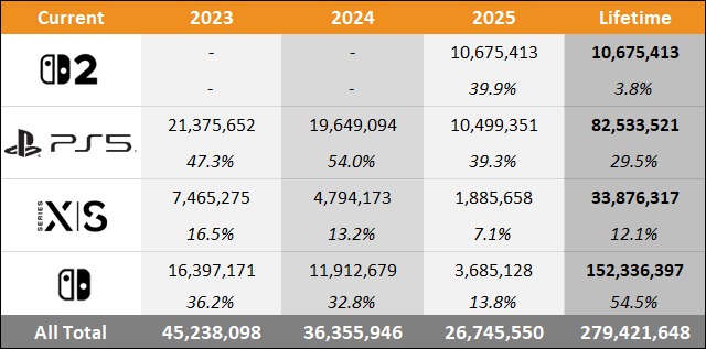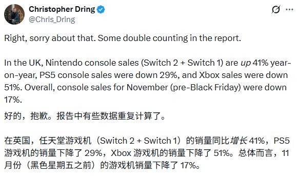 这一趋势与2025年整体市场表现吻合。英国行业分析师克里斯托弗·德林报告显示,11月主机销量同比大幅下滑:任天堂增长41%,PS5下降29%,Xbox跌51%。美国市场同样疲软,截至11月29日硬件支出下降27%至6.95亿美元,而软件支出微增1%至48.4亿美元。