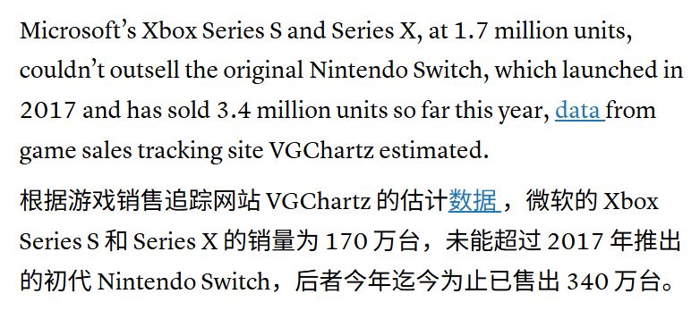 CNBC报告引用VGChartz数据称,Xbox Series X/S年内合计销量约170万台。相比之下,2017年发布的Switch同期销量达340万台。