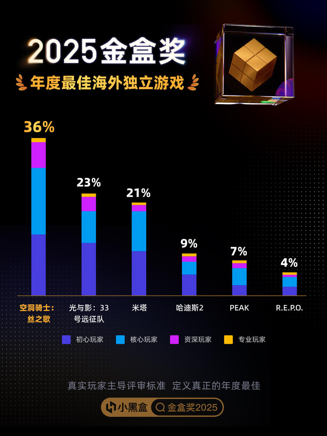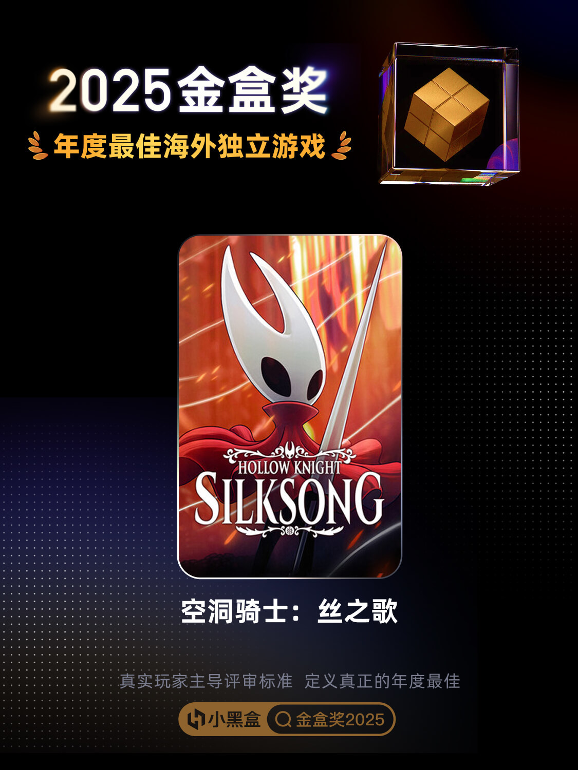 2025小黑盒金盒奖|年度最佳海外独立游戏《空洞骑士:丝之歌》 2025-12-24 PC游戏 恭喜《空洞骑士:丝之歌》荣获2025金盒奖——年度最佳海外独立游戏!您可通过左划图片查看此奖项的详细投票占比数据 更多游戏资讯请关注:电玩帮游戏资讯专区 电玩帮图文攻略 www.vgover.com